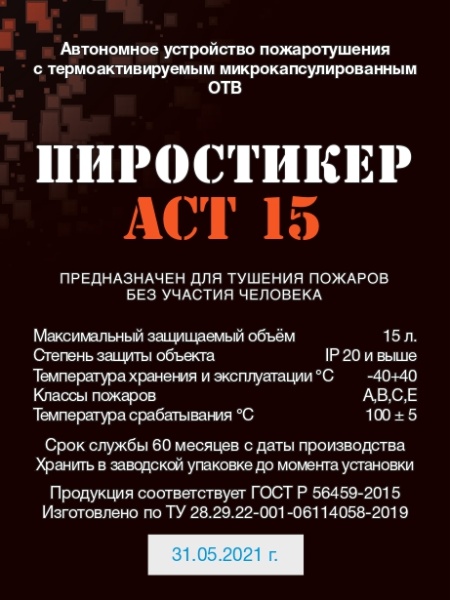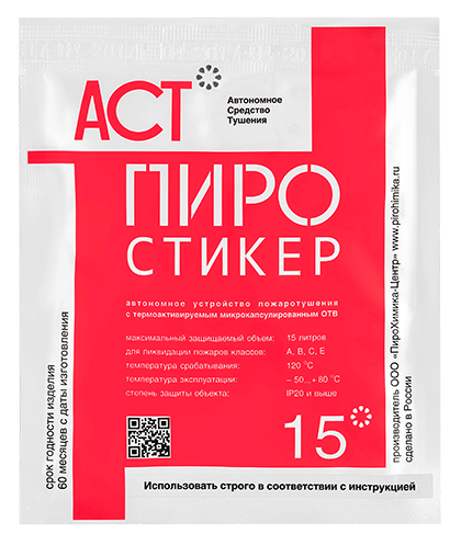 ПИРОСТИКЕР АСТ 15Автономная установка пожаротушения ПИРОСТИКЕР 15 является инновационной разработкой компании "ПИРОХИМИКА". Изделие представляет собой небольшую пластину с ТЕРМА-ОТВ на липкой основе, которая наклеивается на верхнюю внутреннюю часть электрошкафа или др. При возгорании защищаемого объекта происходит резкое повышение локальной температуры, и микрокапсулы, содержащиеся в пластине, высвобождают в окружающую среду огнетушащее вещество, подавляя реакцию горения. На весь процесс уходит не больше нескольких секунд.