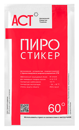 ПИРОСТИКЕР АСТ 60Автономная установка пожаротушения ПИРОСТИКЕР 60 является инновационной разработкой компании "ПИРОХИМИКА". Изделие представляет собой небольшую пластину с ТЕРМА-ОТВ на липкой основе, которая наклеивается на верхнюю внутреннюю часть электрошкафа или др. При возгорании защищаемого объекта происходит резкое повышение локальной температуры, и микрокапсулы, содержащиеся в пластине, высвобождают в окружающую среду огнетушащее вещество, подавляя реакцию горения. На весь процесс уходит не больше нескольких секунд.