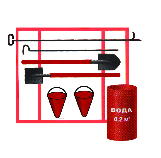 3 Багор 1 шт. 4 Лом 1 шт. 5 Лопата совковая 1 шт. 6 Лопата штыковая 1 шт. 7 Конусное ведро 2 шт. 8 Бочка на 200 литров 1 шт.