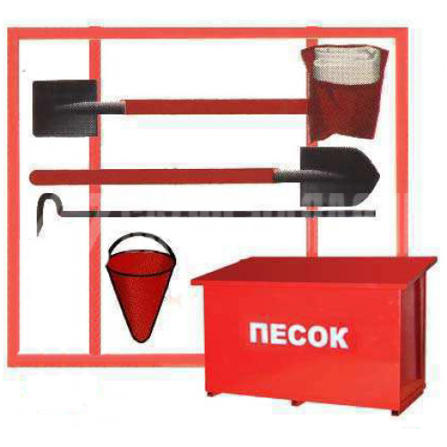 3 Противопожарное полотно (кошма) 1 шт. 4 Лом 1 шт. 5 Лопата совковая 1 шт. 6 Лопата штыковая 1 шт. 7 Конусное ведро 1 шт. 8 Ящик для песка 0,5 м³ 1 шт.